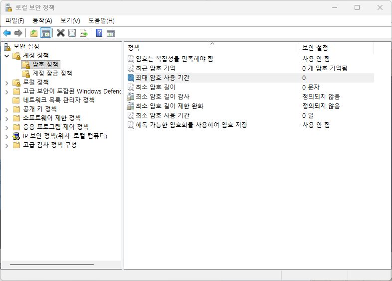 - 좌측에서 [계정 정책] → [암호 정책] / [계정 잠금 정책] 선택